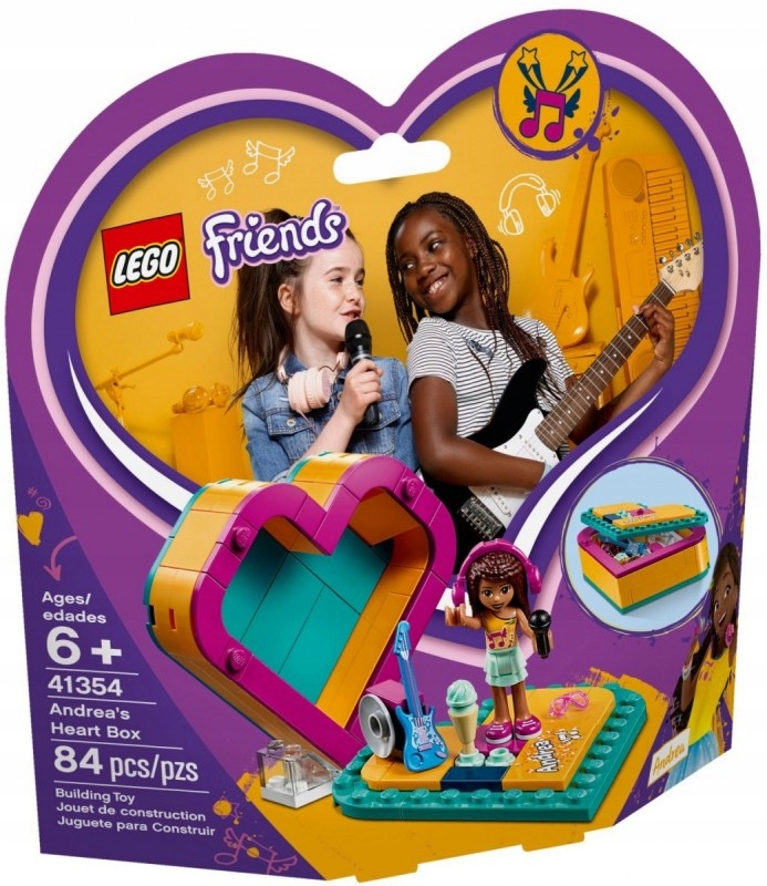 Celý svět může být scénou s LEGO Friends 41354 Krabička ve tvaru srdce Andrey! Sestavte si krabička pro milovnici Andreiných vystoupení a vezměte si ji kamkoli chcete. V balení najdete mikrofon, kytaru, sluchátka a reproduktor, díky nimž může Andrea z řady LEGO Friends sdílet svou vášeň pro hudbu. Sada se skvěle hodí na cesty, protože všechny prvky se vejdou do krabičky ve tvaru srdce a víko je udrží na místě. Kryt lze sejmout a použít jako scénu pro mladou popovou hvězdu z města Heartlake, skvělý nápad na zábavu na cestách! Součástí balení je minipanenka Andrea.