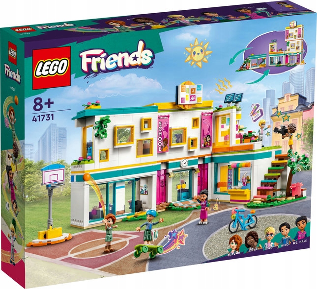 Se stavebnicí LEGO® Friends Mezinárodní škola v městečku Heartlake (41731) budou děti poznávat nové předměty a různé kultury. Mohou nahlížet do sálů, které jsou plné školních doplňků. Modulární konstrukce sady umožňuje přestavovat školu podle vlastních zájmů. Je zde jídelna, přírodovědná třída, chodba se skříňkami, výtvarná místnost, počítačová místnost a koupelna. Venku je basketbalový koš, skateboard a kolo s helmami. Děti se starají o třídního křečka, Bunsena, mohou popustit uzdu fantazii v sále na výtvarnou výchovu nebo si hrát na skwerku – zde je vždy co objevovat.