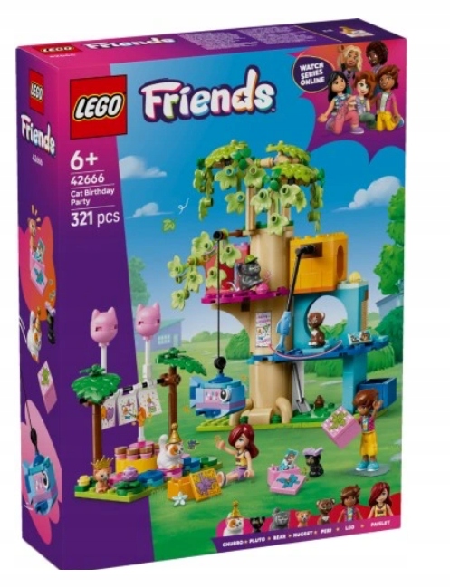- Kreativní příběhy s postavami LEGO® Friends – tento set obsahuje mini panenky Leo a Paisley, pět figurek koček, domeček na stromě pro kočky a scénku s narozeninovým dortem k sestavení.