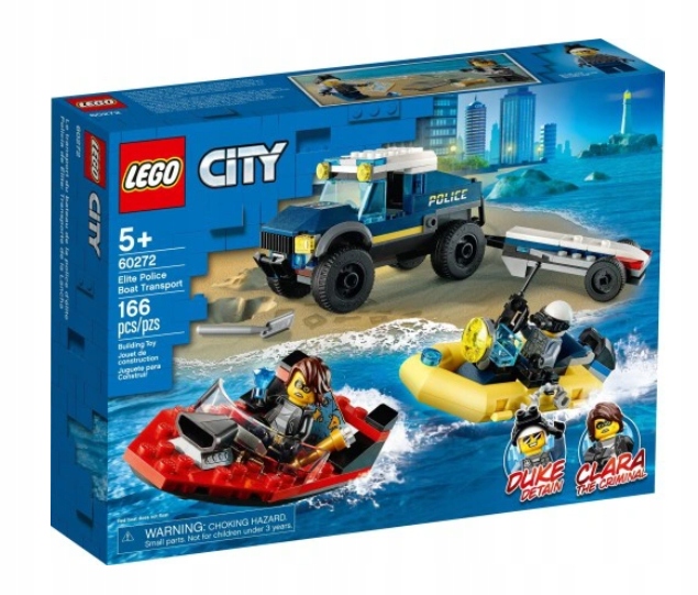 - Obrněný policejní terénní vůz s odnímatelným přívěsem na loď, policejní motorový člun a loďku zlodějky, stejně jako postavy ze seriálu LEGO® City – Duke DeTain a zločinkyně Clara – a mnoho zajímavých doplňků.