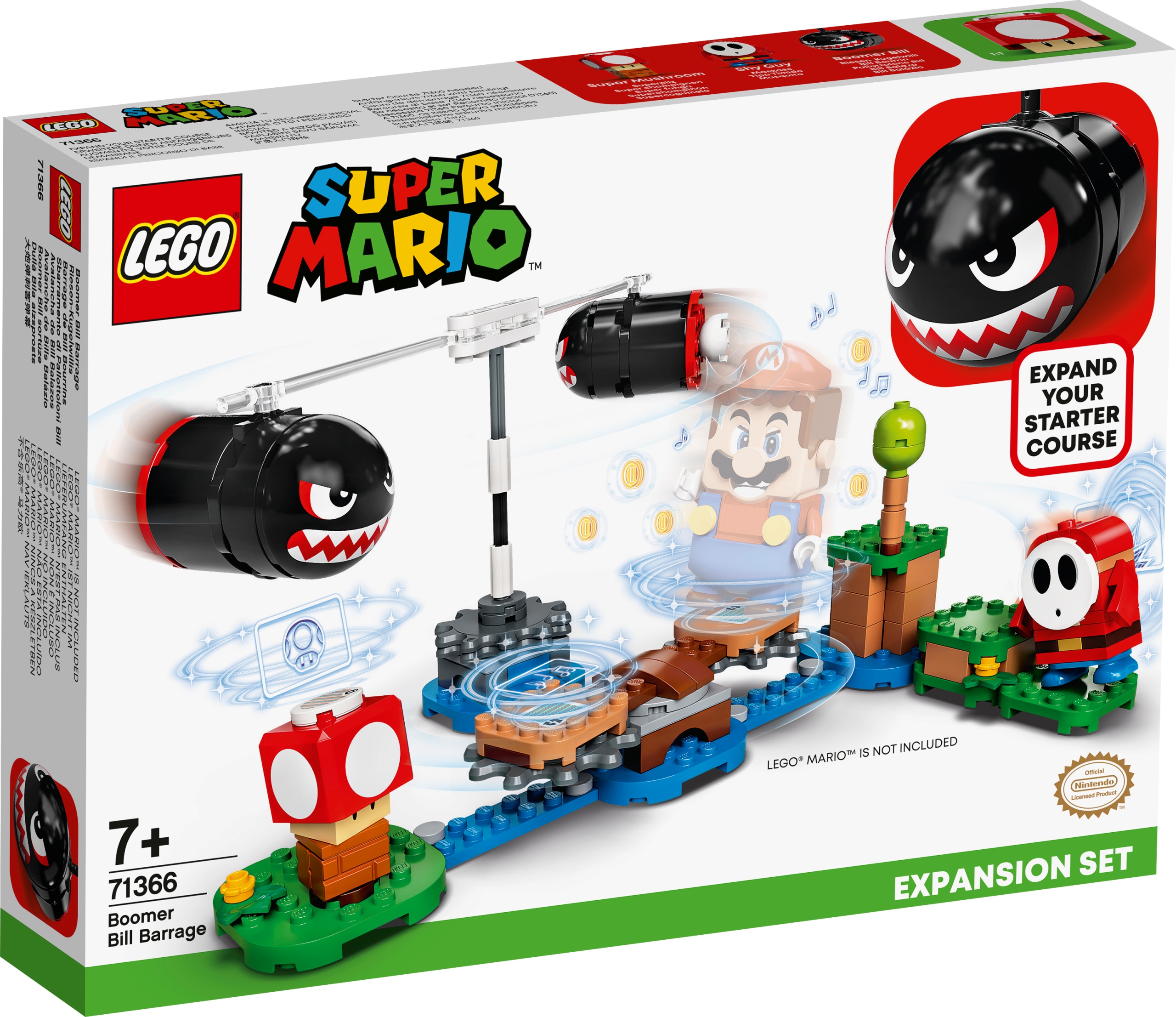 Tato sběratelská hračka je skvělým dárkem pro děti, které již mají sadu LEGO Super Mario Dobrodružství s Mariem – startovní úroveň (71360). Obsahuje spinner se dvěma „létajícími“ figurkami Boomer Billů a otočnou plošinu se dvěma úrovněmi obtížnosti (s povrchem s výstupky a hladkým). Navíc figurka Shy Guye a Super Mushroom ještě více zpestřují zábavu.