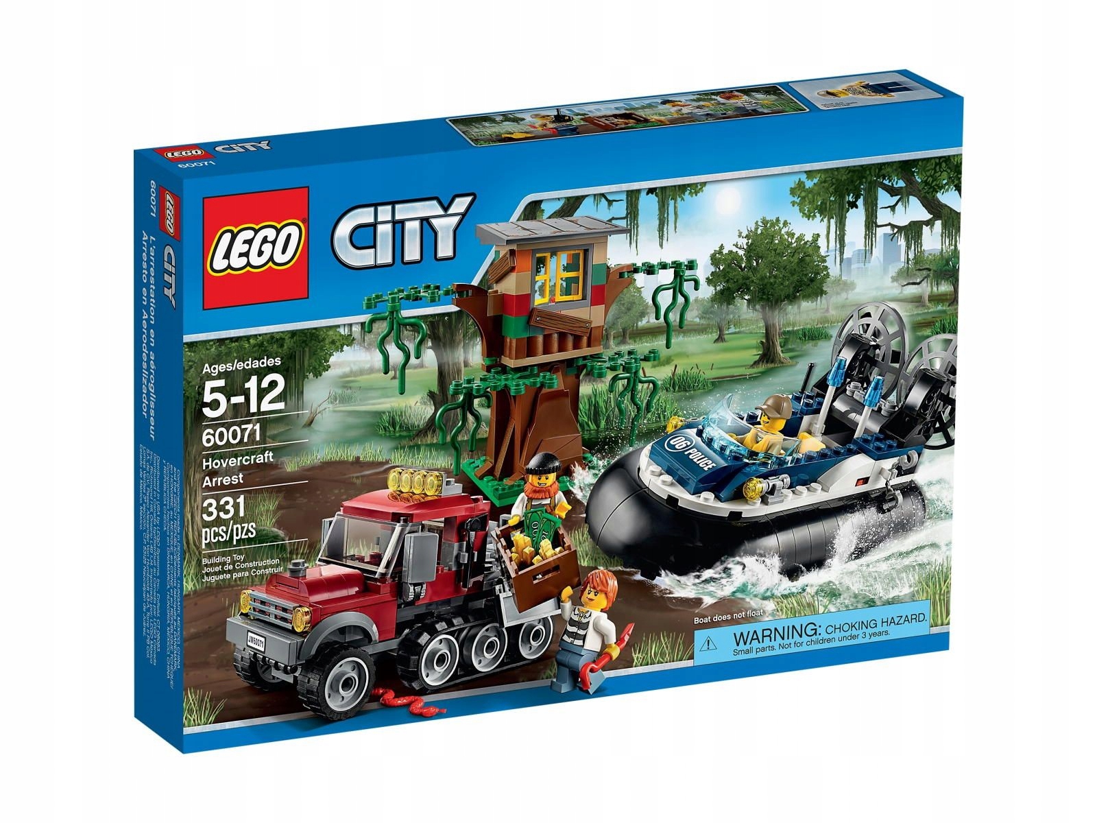 Zloději jsou zaneprázdněni ukrýváním kořisti ve svém úkrytu na stromě hluboko v bažinách. Myslí si, že nikdo nedostihne jejich mohutné polopásové vozidlo. Neuvědomují si však, že každou chvíli přijde policie ve svém nejrychlejším vodním vozidle – policejním vznášedle! Usedněte za kormidlo tohoto mimořádně obratného stroje a vložte plnou sílu – tentokrát se padouchům nepodaří uniknout! Součástí balení jsou 3 minifigurky (policajt a 2 padouši) včetně příslušenství.