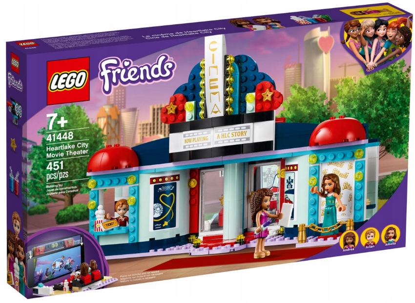 - Hračka obsahuje pokladnu a červený koberec na jedné straně a díky pantům se otevírá a vytváří promítací sál, toaletu a stánek s popcornem. V krabici je minipanenka Andrea LEGO Friends a dvě další mini panenky.