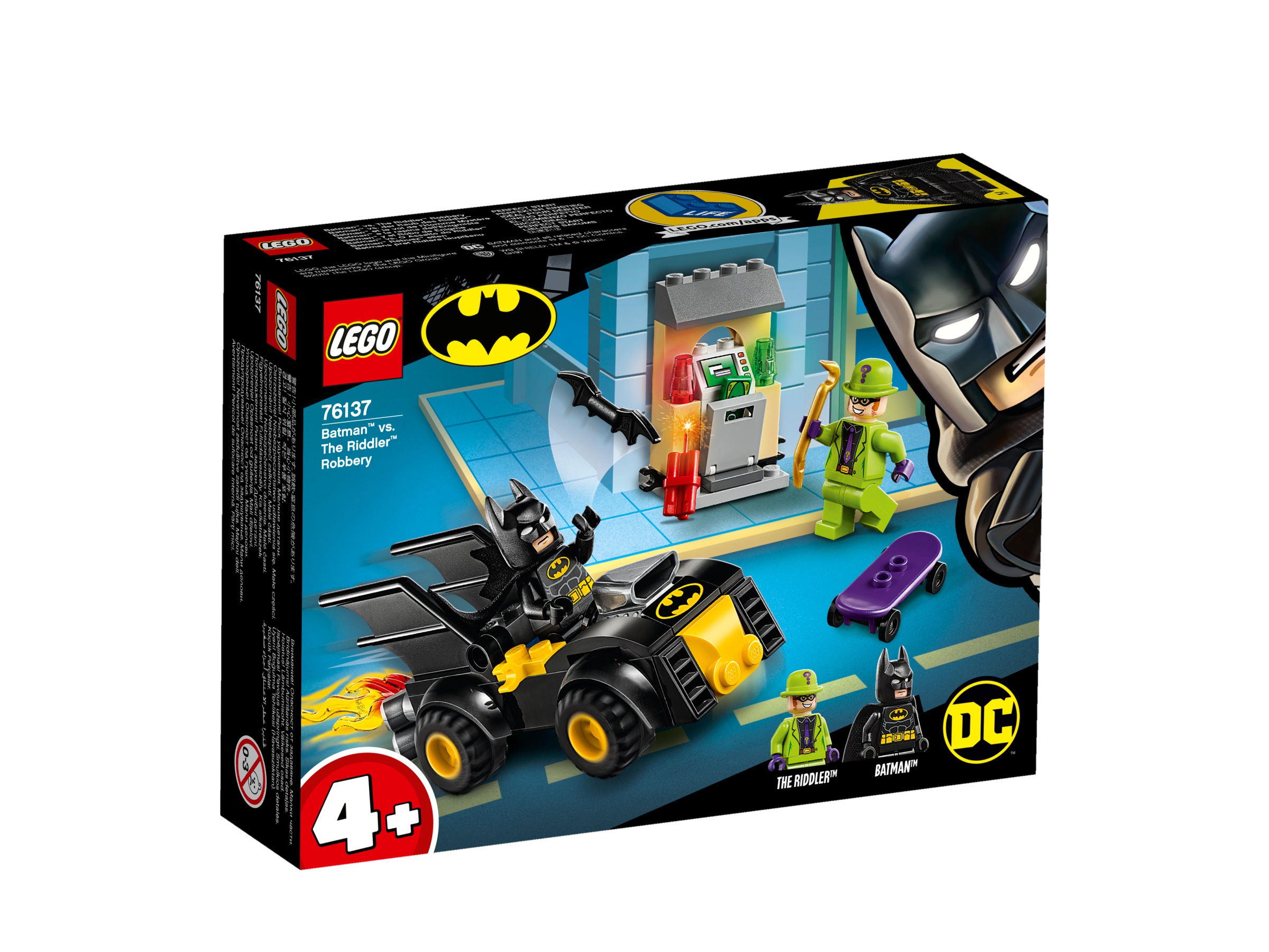 LEGO DC Batman 76137 Batman a loupež Hádankáře uvede předškoláky a malé děti do světa hrdinských dobrodružství. Snadno sestavitelná a bezpečná vzdělávací stavebnice LEGO 4+ obsahuje Batmobile se speciálním startovacím podvozkem, který i úplným nováčkům umožní pocítit hrdost ze samostatného sestavení budov, vozidel a dalších věcí. Součástí sady jsou jednoduché instrukce, které pomohou začít stavět a hrát si, a mladým konstruktérům vysvětlí účel jednotlivých kroků stavění. Díky tomu si děti rozvíjejí představivost a sebedůvěru. V kompletu je také bankomat postavený z kostek s místem pro připevnění dynamitu. Je to skvělý tip na dárek pro milovníky Batmana – dětem se jistě bude líbit vytváření vlastních příběhů s dvěma minifigurkami vybavenými zbraň a příslušenstvím, jako je skateboard Hádankáře postavený z kostek.