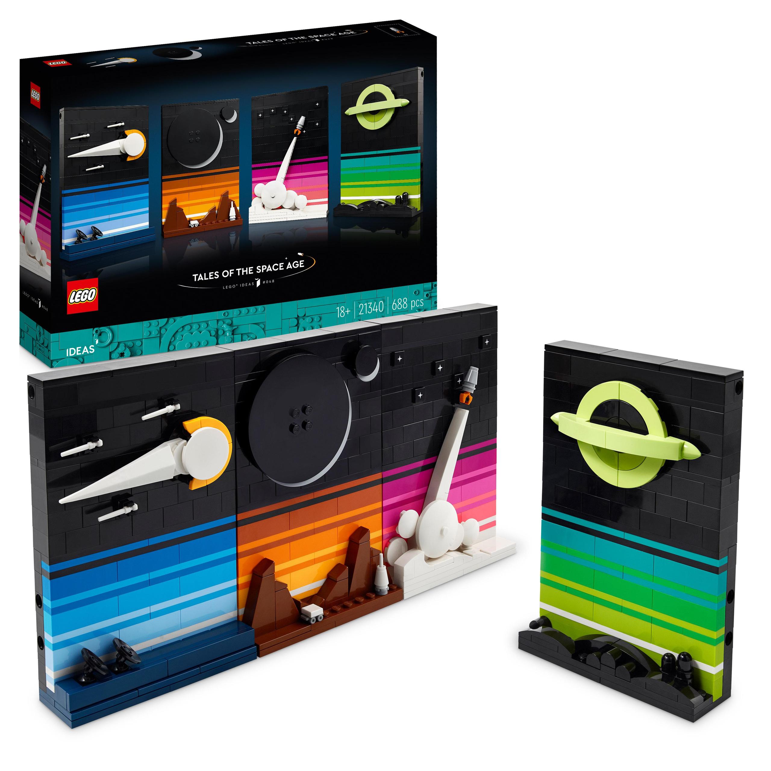 Vypněte tryskové motory a nechte své myšlenky létat vesmírem se stavebnicí LEGO® Ideas Příběhy z dob vesmírných závodů (21340). Sada obsahuje čtyři 3D pohlednice, které lze spojit a každá z nich představuje scény inspirované sci-fi mýty z osmdesátých let XX. století, filmy, knihami a plakáty. Postavte z kostek LEGO minimalistické modely observatoře pro pozorování komet a padajících hvězd, lunární základny a zatmění Měsíce, raketoplánu brázdícího vesmír a černé díry.