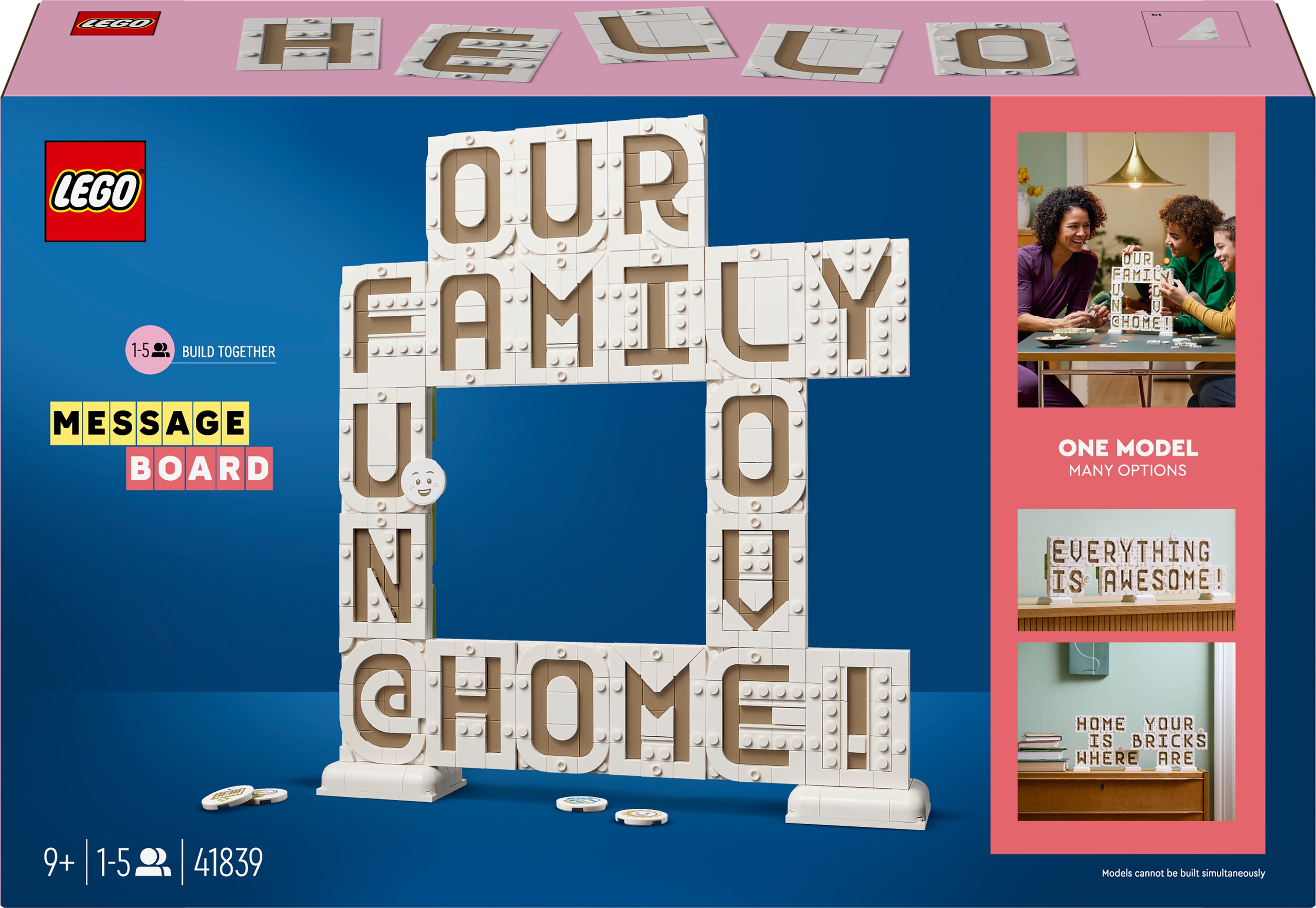 Na rodiny s dětmi od devíti let čeká kreativní zábava a skvěle strávený čas při stavění až 30 písmen latinské abecedy a vytváření pěkné nástěnky (41839). Sada na stavění obsahuje znaky s akcenty, takže můžete vytvářet zprávy ve svém rodném jazyce (pouze latinská abeceda). Tato přestavitelná LEGO tabule obsahuje 10 samolepek s emotikony, které si můžete přidat na tabuli, a navíc návod, inspiraci a čtyři plakáty, které vám pomohou s tvorbou písmen.