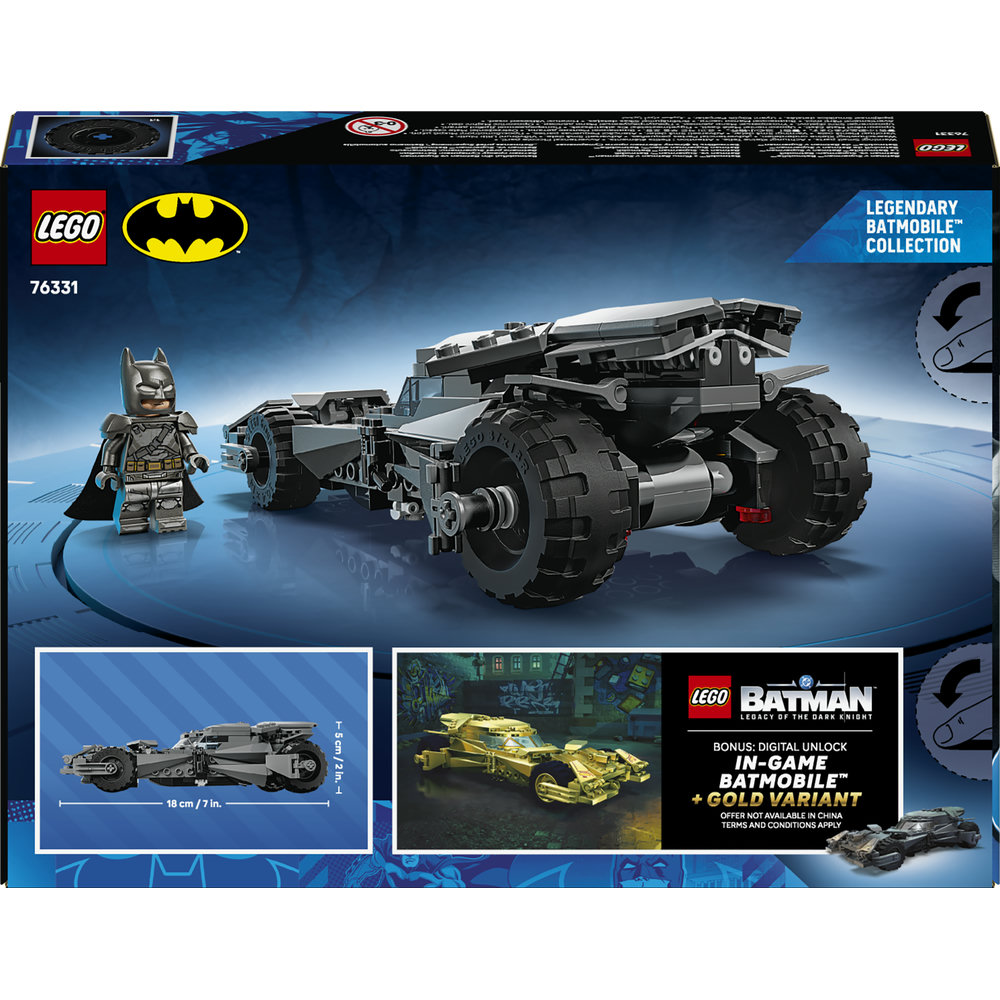Připojte se k Batmanovi a zažijte akční superhrdinská dobrodružství se stavebnicí Batman vs. Superman™: Batmobil (76331), která bude skvělým dárkem pro kluky i holky od 9 let. Na oslavu 20. výročí řady LEGO® DC Batman přinášíme tuto sběratelskou stavebnici, ve které najdete slavné auto a minifigurku obrněného Batmana s látkovým pláštěm. Stavebnice Batmanova Batmobilu obsahuje přední nefunkční vystřelovač, otevírací kokpit a přední světla znázorněná grafickými samolepkami. Do interiéru vozu je zabudována pamětní zlatá mince. Minifigurku Batmana lze posadit do kokpitu vozidla. A aplikace LEGO Builder dodává dětem při stavění jistotu – můžou přibližovat a otáčet modely ve 3D a sledovat postup pomocí srozumitelného digitálního návodu. Stavebnice obsahuje 220 dílků. Bonus: Odemkněte digitálně: Získejte Batmobil inspirovaný filmem Batman v Superman a zlatou variantu Batmobilu ve videohře LEGO Batman – Legacy of the Dark Knight™. Naskenujte QR kód v návodu na stavění a postupujte podle pokynů.