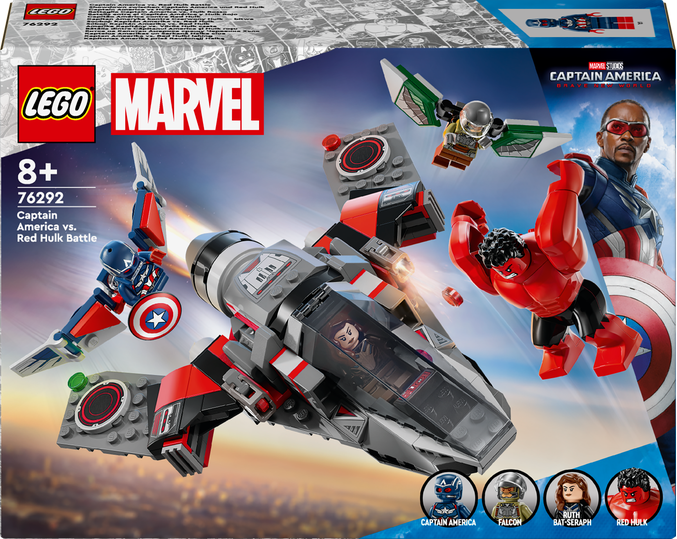 Součástí této stavebnice je působivá řada minifigurek: Kapitán Amerika a Falcon (oba mají zatahovací křídla), Red Hulk a Ruth Bat-Seraph. Nechybí velký otevírací kokpit s prostorem pro minifigurku pilota. Děti tento sestavitelný model snadno uchopí do rukou a mohou s ním létat a útočit pomocí 2 vystřelovačů. Horní část stíhačky lze odejmout a odhalit skrytý úložný prostor s místem na malé dílky a tajemné medaile v zadní části. Model stíhačky se skvěle hodí k nezávislému hraní. Děti mohou přibližovat a otáčet stavebnice ve 3D a sledovat svůj pokrok pomocí zábavné a intuitivní aplikace LEGO Builder.
