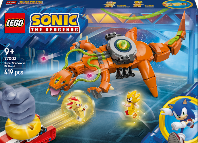 Inspirujte se k akčním dobrodružstvím s videohrou pro děti a fanoušky od 9 let se stavebnicí Super Shadow vs. Biolizard (77003). Tato sběratelská stavebnice z řady LEGO® Sonic the Hedgehog™ obsahuje figurku Biolizarda z kostek s energetickým modulem, vystřelovač koulí rychlosti, kouli rychlosti a doplňky včetně Chaos Emeraldu. Tento zábavný dárek pro gamery obsahuje také 2 další postavy: Minifigurku Super Shadowa a Super Sonica.