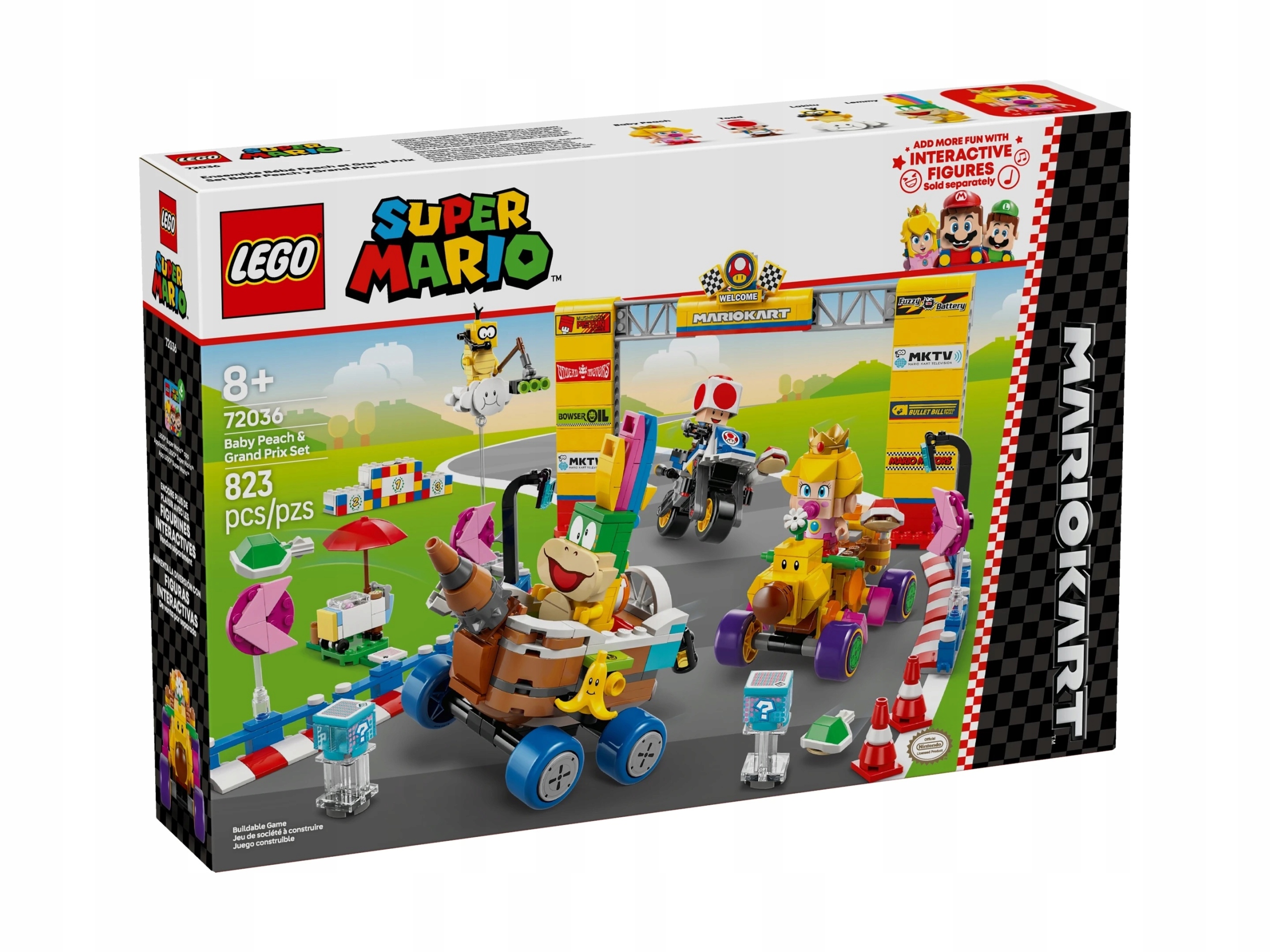 Usaď svou figurku LEGO Maria™, LEGO Luigi™ nebo LEGO Peach™ (figurky nejsou součástí balení, dostupné v sadách 71439, 71440, 71441 nebo 72043 – prodávají se samostatně) za volant motokáry a hraj interaktivně! Vozidla spouštějí zvukové a vizuální efekty, napodobující troubení, driftování a zasklení a přenášejí emoce z obrazovky přímo do vašeho pokoje.