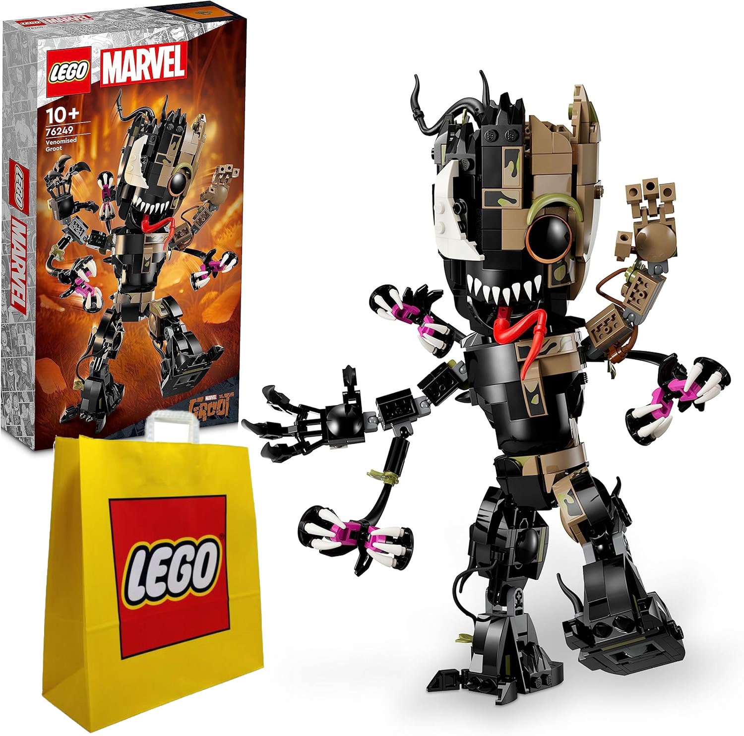 Postavte si figurku Groota, který se částečně stal Venomem, a pak doplňte dílo a udělejte z něj plnohodnotného Venoma! Kolik hrůzy s dlouhým jazykem, ostrými zuby a chapadly přidáte do supersladkého Groota, záleží jen na vás. Díky pohyblivým rukám, nohám, kyčlím a hlavě je Groot jako Venom vždy připraven na akci a dobrodružství! • Grootova transformace ve Venoma – sada LEGO® Marvel Groot jako Venom (76249) poskytuje fanouškům Marvelu zábavu s možností přestavování figurky kostka po kostce,když Venom stále více přebírá kontrolu nad Grootem • Kultovní postavy z Marvelu – tato pohyblivá figurka představuje malého Groota,jehož proměnlivou měrou ovládá Venom se slavným dlouhým jazykem,ostrými zuby a chapadly • Hrajte si nebo postavte na poličku – děti si postaví vlastní pohyblivou figurku Groota jako Venoma,a poté přidávají stavebnice,aby změnila její vzhled, když Venom postupně převezme kontrolu nad Grootem • Dárek pro děti – je to skvělý dárek k narozeninám,svátky nebo bez příležitosti pro děti od 10 let,které mají rády filmy Marvela, roztomilého malého Groota nebo zákeřného mimozemšťana Venoma • Zábava kdekoli – tato praktická figurka na hraní a ozdoby je vysoká 27 cm a umožňuje dětem vychutnat si nápadité dobrodružství s Grootem v podobě Venoma všude tam,kam se povedou • Intuitivní pokyny – děti si mohou stáhnout aplikaci LEGO,používat digitální nástroje pro přibližování a otáčení modelů ve 3D,ukládání sad a sledování pokroku