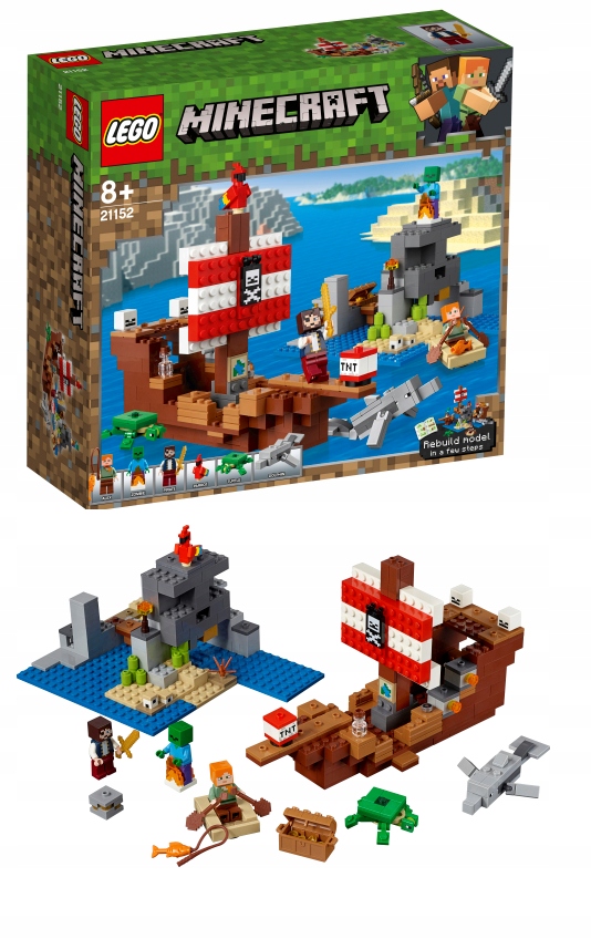 • Součástí balení jsou dvě minifigurky: pirát a Alex, stejně jako zombie ze hry Minecraft™ a figurky delfína, papouška a želvy.